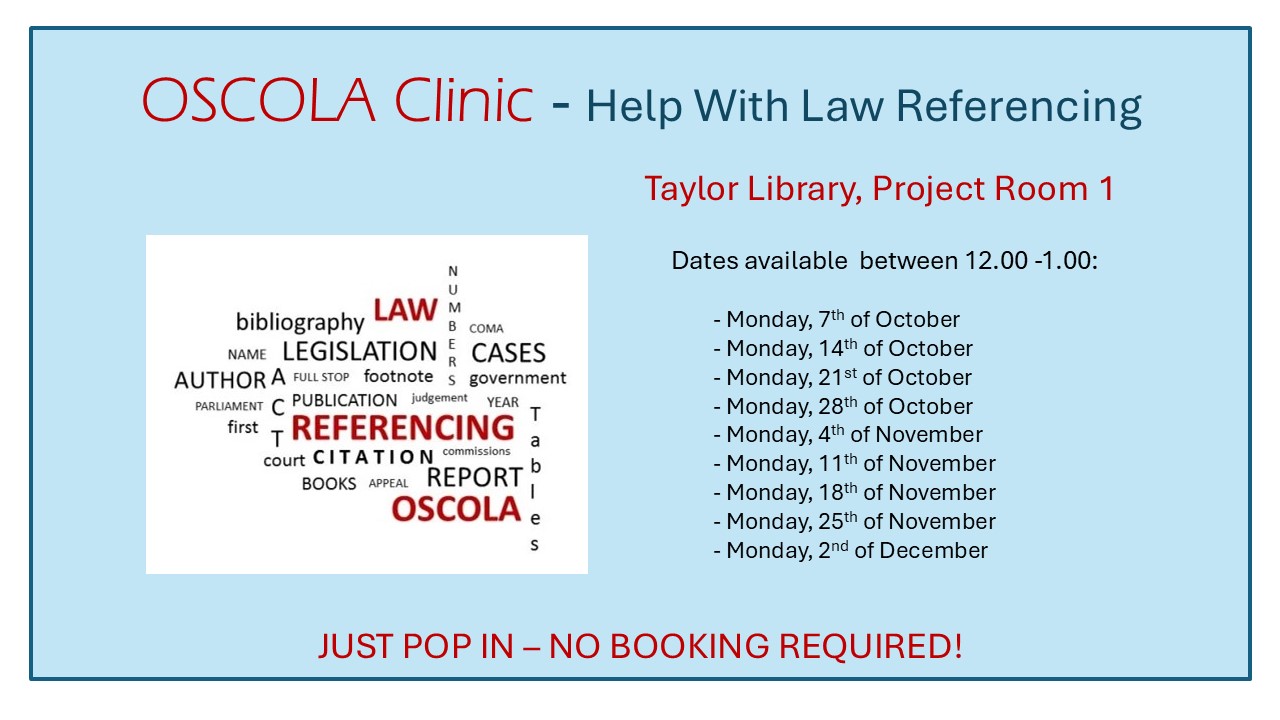 OSCOLA Clinic is returning to Taylor Library this academic year to provide effective help to law students with OSCOLA Referencing Style. Mastering OSCOLA takes time and real dedication because the rules are very complex.