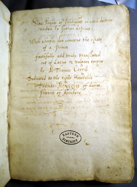 In 1594 the Master of New Aberdeen’s Grammar School, Thomas Cargill (d. 1602), made a translation of the Flemish scholar Justus Lipsius’ bestselling 1589 Politicorum sive Civilis Doctrinae Libri Sex, the Six Books of Politics or Civil Doctrine.