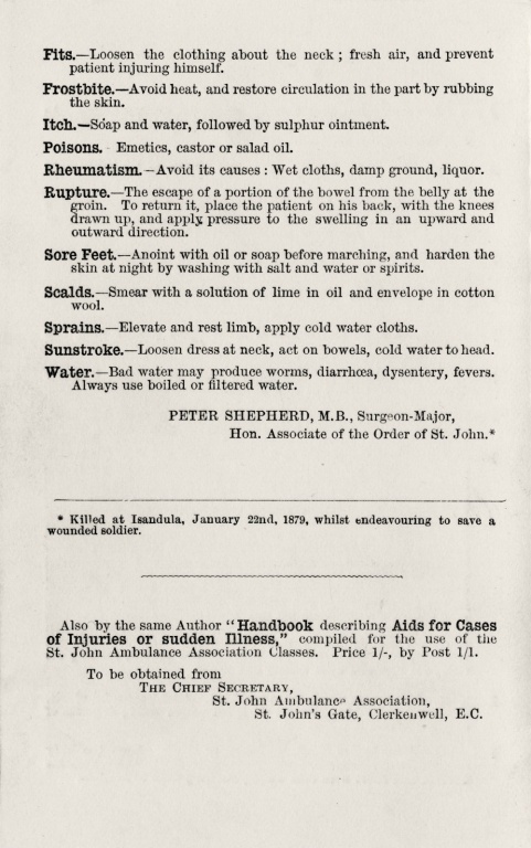 This talk is part of a series accompanying the exhibition "Medicine in Wartime" at the Sir Duncan Rice Library, University of Aberdeen, which includes a copy of the pocket aide-mémoire devised for use by British troops, by Surgeon Major Peter Shepherd. It was commissioned by the newly formed St John Ambulance Association. Tragically, Shepherd was killed helping the wounded at the Battle of Isandhlwana, during the Anglo-Zulu War, and his guide was published posthumously.