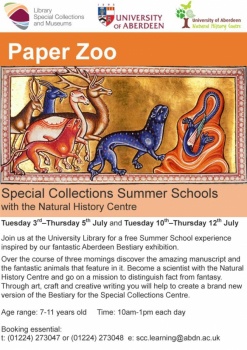 Join us at the University Library for a free Summer School experience inspired by our fantastic “Gilded Beasts” exhibition. Over the course of three mornings discover the amazing Aberdeen Bestiary manuscript and the animals that feature in it. Become a scientist with the Natural History Centre and go on a mission to distinguish fact from fantasy. Through art, craft and creative writing you will help to create a brand new version of the Bestiary for the Special Collections Centre.