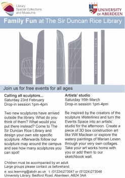 Two new sculptures have arrived outside the library. What do you think of them? What would you put there instead? Come to The Sir Duncan Rice Library and design your own site specific sculpture. Afterwards follow our sculpture map around the campus and see how many sculptures you can spot!