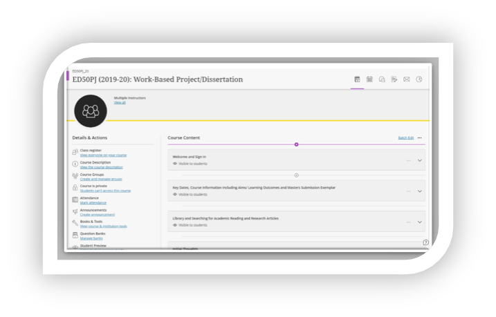 Full details of the resources you can access are available in the Library Materials or Library Resources section of your course in MyAberdeen, your virtual learning environment at https://abdn.blackboard.com/ . The image below gives you an indication of what your course area may look like: