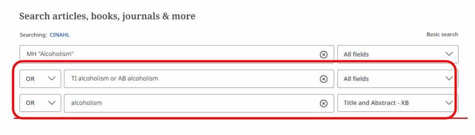 1. Using the Advanced Search option, type TI followed by your term, then OR, then AB followed by your term (e.g. TI alcoholism or AB alcoholism). TI stands for title and AB stands for Abstract. Click the Search button.