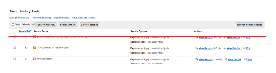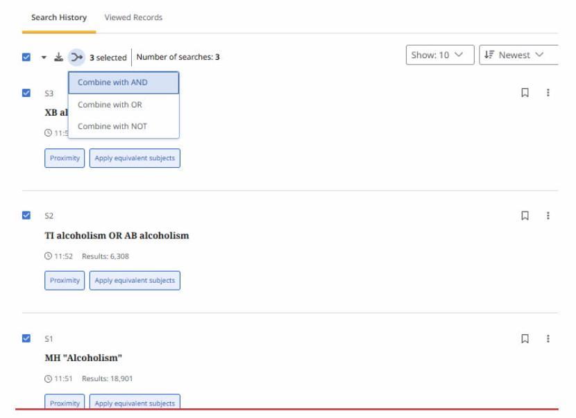 1. Select the searches that you want to combine by clicking on the searches' check-boxes in the left- hand column. Click on either the Combine with AND or Combine with OR or Combine with NOT button. Ensure that the top search field of the three lines above the Search History section is blank before you do this.