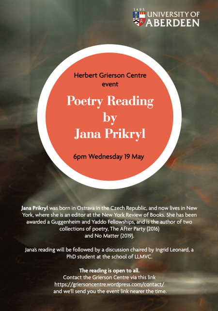 The Herbert Grierson Centre is hosting a poetry reading with Jana Prikryl, followed by a discussion chaired by Ingrid Leonard, PhD student at the school of LLMVC.