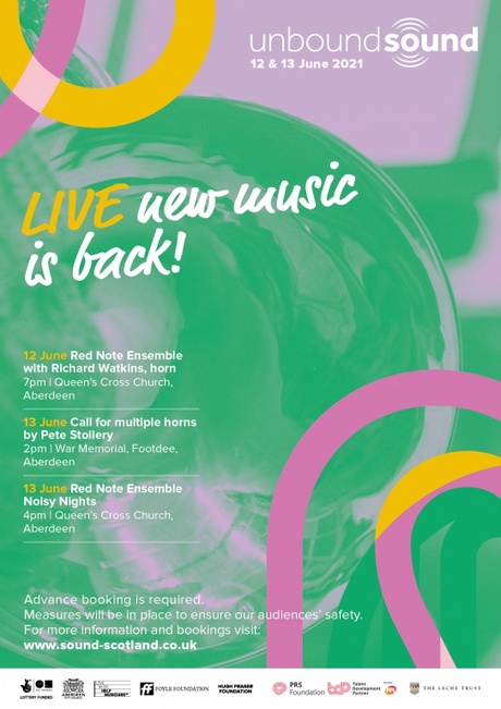 The unboundSOUND programme is part of Aberdeen's sound festival and includes world premiere performances from Red Note Ensemble with horn player Richard Watkins of new works by Philip Cashian, Rylan Gleave and Aileen Sweeney.