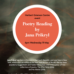 The Herbert Grierson Centre is hosting a poetry reading with Jana Prikryl, followed by a discussion chaired by Ingrid Leonard, PhD student at the school of LLMVC.