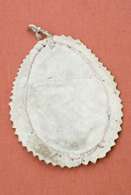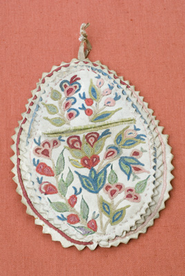 Wall pockets of unsmoked caribou hide with floral designs worked in chain and button-hole stitch in coloured silk thread were popular decorative items in the late nineteenth and early twentieth centuries. Many Cree and Métis women in northern Manitoba made these to sell at Hudson’s Bay Company stores.