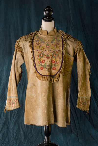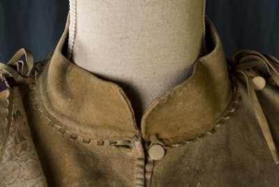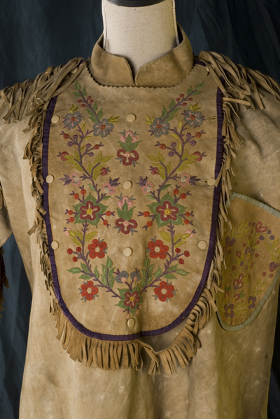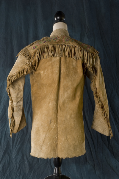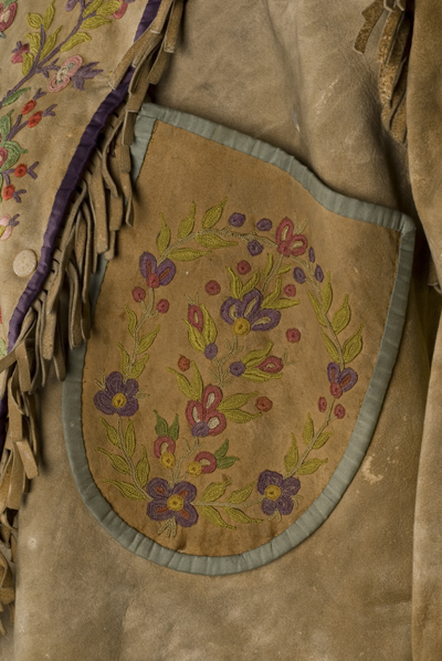 This jacket was made for Henry Moir at York Factory in 1917. He wrote about it to his mother in 1916. "I am sending to Churchill for some doe skins to make a Deerskin jacket, which will be silk worked down the front, on the cuffs, shoulders and neck. When completed they are worth fifty dollars in the States but I will send it home as an heirloom to the Family Estate."