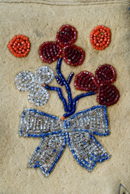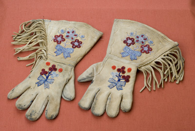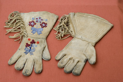 These deer hide gloves are based on a work glove pattern and have been stitched using a sewing machine. The pattern of ribbons and berries was perhaps copied from an illustration in a magazine or book.