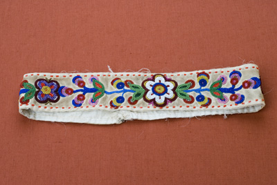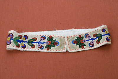 This beaded strip has been worn as a belt and is made of unsmoked caribou hide, edged with ivory ribbon. The floral designs are of the kind commonly made by Cree women in northern Manitoba.