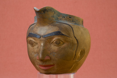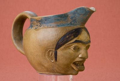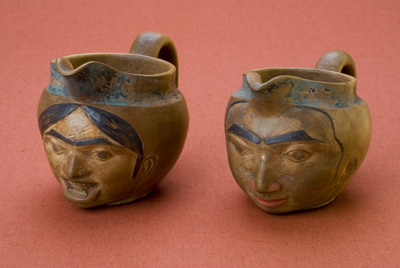 These wooden pitchers were made by a Haida artist for sale to Euro-Americans visiting Haida Gwaii. Carved and colourfully painted in a portrait style, the pitcher on the left shows a woman with a decorative labret in her bottom lip.