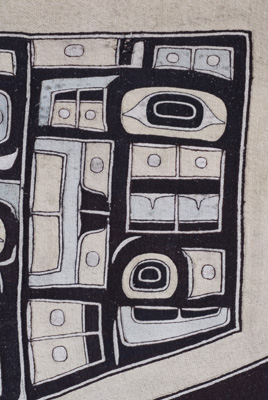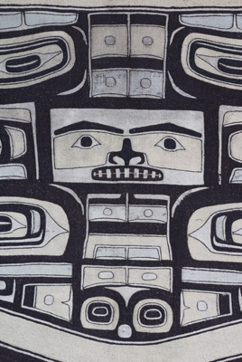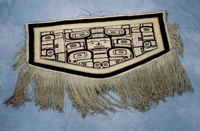 Chilkat blankets are highly valued by northern Tlingit and Tsimshian people. Woven in yellow cedar bark and mountain goat wool by women from designs painted by men on a pattern board, the blankets were worn at ceremonial occasions to show the clan crest of their owner, suspended over graves or displayed inside a house. This blanket features a design known in English as the 'diving whale'.