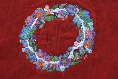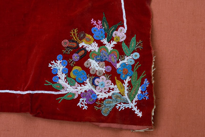 This red velvet cloth with beadwork designs is one of several brought to Scotland by men who worked at York Factory during the early twentieth century. It was possibly made by two women working together, as the beadwork on the top left is neater, which suggests a more experienced seamstress.