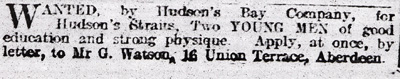 Towards the late nineteenth century, with the drop in the market for furs and the formation of the Dominion of Canada in 1867, the Hudson's Bay Company's business shifted focus to retail sales and commercial property. Fur buying continued in some parts of Canada, however, and reliable staff were required to manage trading operations in the Arctic and boreal forest. Though labourers were still hired locally, the northeast of Scotland became the key recruiting ground for clerks and store managers. Adverts were placed in local newspapers and company agents recruited young men from the city and nearby towns and villages. Local schools, such as Robert Gordon's College in Aberdeen, were also targeted by the Hudson's Bay Company.