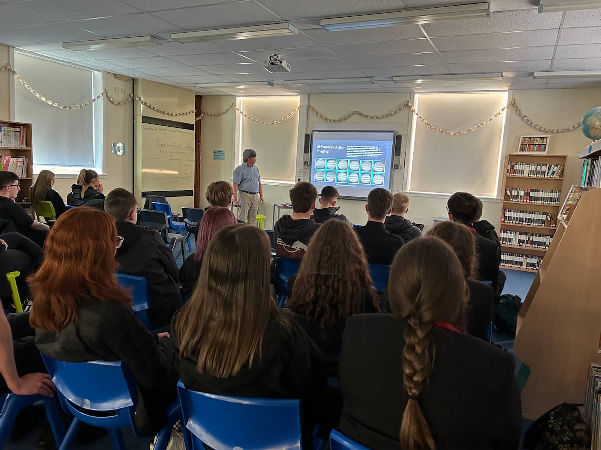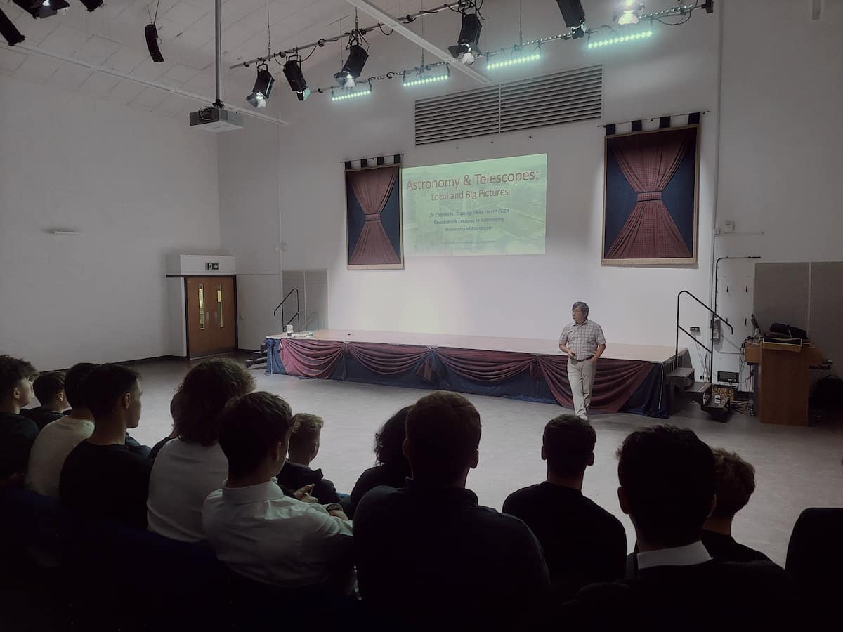 Dr Charles Wang gave a talk on modern astronomy on the 2nd of October 2024 at Fraserburgh Academy, at the invitation of Physics Teacher Mr Fraser Burnett. Surrounded by vast and exquisite countryside in Fraserburgh, Dr Wang was delighted to visit this vibrant academy with a growing number of pupils interested in physics. Following the talk, Mr Burnett remarked "It was both enjoyable and accessible" and "hit the mark with the level at which the talk was pitched with all our pupils taking away a newfound interest in the night sky." Among the audience was a Higher Physics pupil who shared his amazement about how maths ties in with gravity that pulls together all things on Earth and in space.