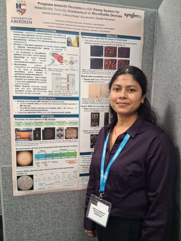 Her poster was about her research work developing a microfluidic device to study the human neuromuscular system in vitro. Amrita is supervised by Dr Claudiu Giuraniuc in the Department of Physics and Dr Guy Bewick at the Institute for Medical Sciences.