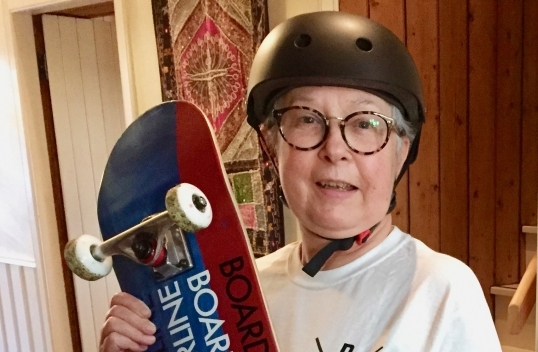 “I must be a fairly amusing sight in my living room with my board on a bathmat and wearing a crash helmet but I have to start somewhere and I’m told this is the best way to build up muscle memory and prepare for the trick until I have a little more energy.” added Elaine. “And there’s less chance of falling off!