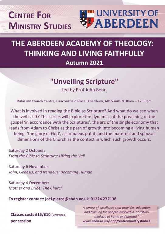 What is involved in reading the Bible as Scripture? And what do we see when the veil is lift? This series will explore the dynamics of the preaching of the gospel ‘in accordance with the Scriptures’, the arc of the single economy that leads from Adam to Christ as the path of growth into becoming a living human being, ‘the glory of God’, as Irenaeus put it, and the maternal and spousal dimensions of the Church as the context in which such growth occurs.