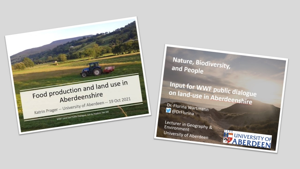 Geography staff members Katrin Prager and Flurina Wartmann were invited to give expert input to a series of public dialogues held across Aberdeenshire. The dialogues with members of the public were facilitated by the World Wildlife Fund for Nature WWF through their initiative UK Land Use Conversation which are running in seven different locations across the UK, including Aberdeenshire.