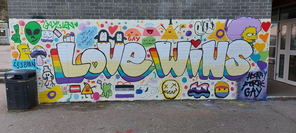 University of Aberdeen’s WayWORD Festival has helped Hazlehead Academy become the first school in Aberdeen city/shire to achieve a Silver LGBT Charter Award, running a six-week ‘Art & Activism’ project as part of the festival’s community legacy programme. Collaborating with Outlines Collective, a graffiti artist organisation, pupils learned about the history of graffiti as activist art and produced designs for pasteup posters and a mural wall. The ‘Love Wins’ wall was painted by pupils working with Naomi Christie and Kirsty Lawie from WayWORD and Outlines Collective. The mural incorporated images designed by the students and characters and symbols from popular culture. The message was chosen to celebrate diversity and inclusion in the school. LGBT Charter Awards are given by LGBT Youth Scotland, who are Scotland’s national charity for LGBTI young people, and complimented Hazlehead Academy for ensuring their school was inclusive, with measures such as “Creating inclusive anti-bullying, uniform, and social dance policies”.