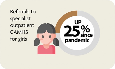 Girls are being referred to mental health specialists more than boys since the pandemic. Before the pandemic, boys and girls had equal numbers of referrals to specialist outpatient mental health services. Since 2020, referrals for girls were up 25 percent, but down 6 percent for boys. The study also found differences in who was accepted for care at CAMHS. Originally, boys and girls were equally likely to be accepted, but in 2021, girls made up two-thirds of those accepted.