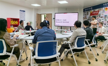 Faculty from SCNU and UoA shared their research and project developments, with over 20 participants including SCNU/UoA faculty and student representatives attending onsite and six UoA professors/doctors attending online.Dr. Binod Bhattarai from UoA and Prof. Shaoming Chai from SCNU jointly introduced the seminar's background and objectives, as well as the theme of the first seminar. Dr. Aiden Durrant from UoA presented his work on "Hyperspherical Regularized Neural Networks for Self-Supervised Learning", and Dr. Guojing Zhou from SCNU shared his research on "Generating Teaching Decision Schemes with Hierarchical Reinforcement Learning". All participants raised in-depth discussions and questions, particularly around the two shared presentations, sparking interest in potential collaborative research.The seminar was deemed as a success, meeting its intended goals, with faculty from both universities eager to further their academic exchange and collaboration.