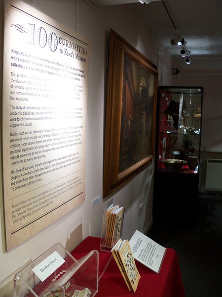 In King’s Museum visitors can see “100 Curiosities”. This exhibition displays objects chosen by a hundred of the museum’s friends. Each person has chosen an object that has a personal resonance and has written a caption of 100 words to explain its significance. These include scholars who have selected an object that relates to their own research, such as a historian who chose a Renaissance coin minted in Aberdeen, a zoologist who selected a set of shark jaws, and a geologist who chose a trilobite fossil.