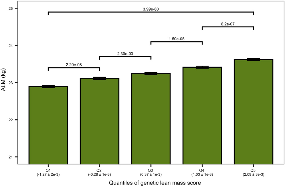 Figure 2. Genetic Lean Mass Score Affects the Appendicular Lean Mass (ALM) in Elderly Humans. The plot shows the ALM (kg) of the elderly cohort on the vertical axis. The elderly cohort was ranked by “genetic lean mass score” (calculated as a sum across 182 loci of the products of locus effect size and genotype dosage) and clustered in five quantiles (Q1–Q5) (horizontal axis). The average genetic lean mass score (±standard error) of each quantile is shown in parentheses below the horizontal axis. The overall quantile effect of the genetic lean mass score on ALM was tested with the Kruskal-Wallis test, and the resulting p-value is presented on the horizontal line above the bars. The ALM median differences between the groups were tested using a Wilcoxon test; the significance level of each comparison is presented above the horizontal lines with a Holm adjusted p-value (Hernandez Cordero et al. 2019).