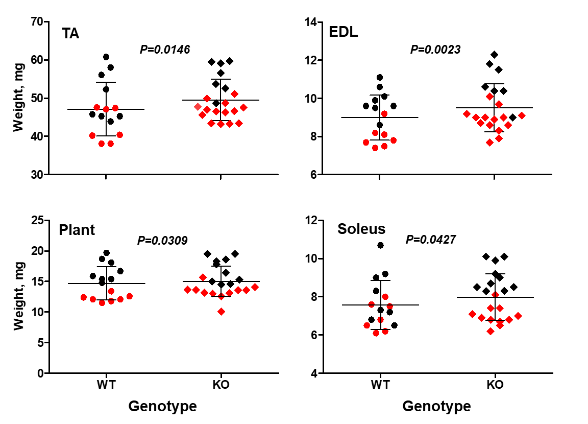 Figure 3. Stc2 effects on muscle weight. The knockout mice (KO) have larger tibialis anterior (TA), externsor digitorum longus (EDL), plantaris (Plant) and soleus muscles. Sex-adjusted weight shown. Red symbols - female, black - male. The horizontal line represents the mean value, the error bars represent standard deviation (modified from Lionikas et al. 2023).