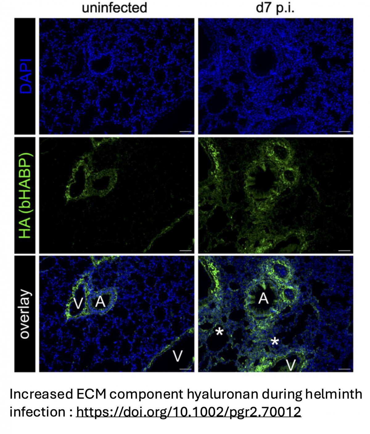 Chitinase-like proteins (CLPs) are highly expressed during inflammation, tissue injury/repair and fibrosis. During helminth parasite infection, CLPs regulate immune responses and drive tissue repair. However, in more chronic settings like allergic airway pathology akin to asthma in people, CLPs are responsible for ECM remodelling in the lung, independent of effects on the adaptive immune response. Using animal models, human lung tissue resection, 3D lung slice cultures and a range of sophisticated techniques (e.g. microscopy, flow cytometry, scRNAseq, qPCR) we are exploring how CLPs influence the matrix, with a focus on macrophage-fibroblast cross-regulation. See our preprint that describes the ability of CLPs to influence ECM remodelling