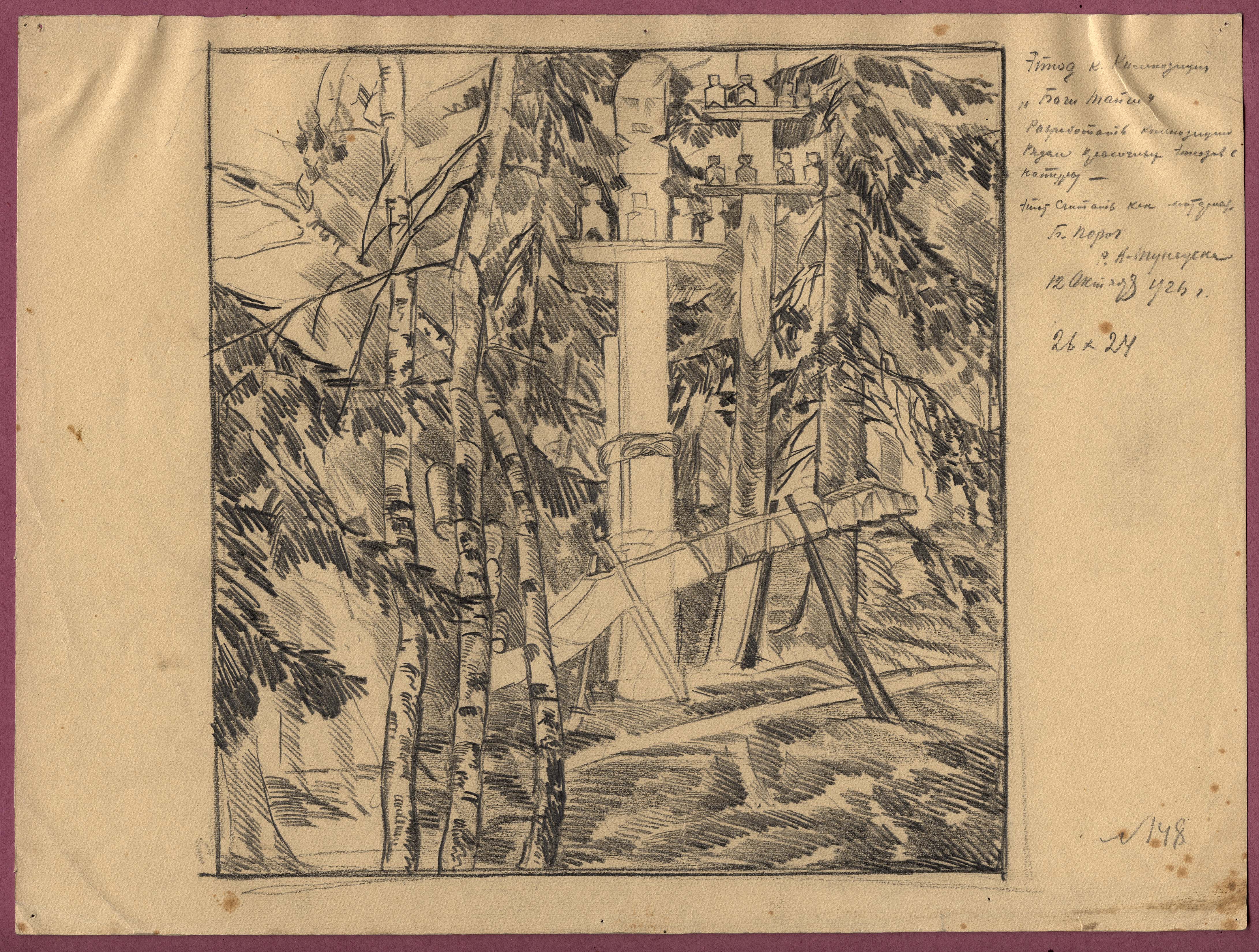 Number 94 in the museum catalogue of drawings by Lekarenko. Sketch to a composition "Gods of taiga". To develop a composition by drawing several colorful sketches from nature - consider this as material. Bol'shoi Porog. R. N. Tunguska. Tungusy of Chunskii clan. 12 October 1926