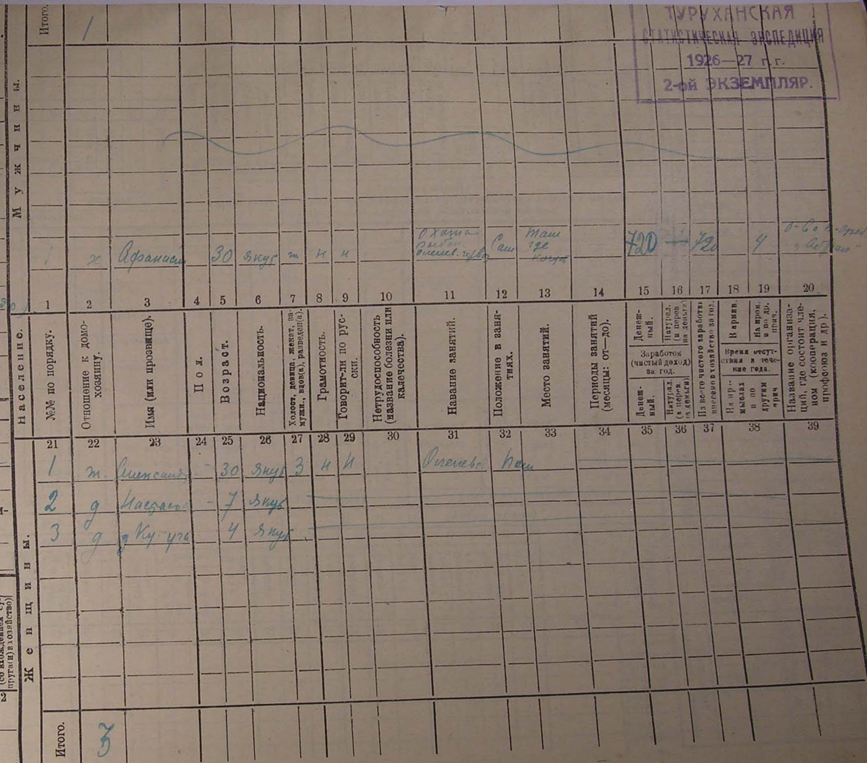One unique feature of the polar census documents is a detailed table giving data on men and women at the individual level. Beyond simple demographic variables, this table also specifies the relation of each individual to the head of the household, their nationality, their occupation(s), and very precise details of where, in what capacity they worked, and their income from wage labour.