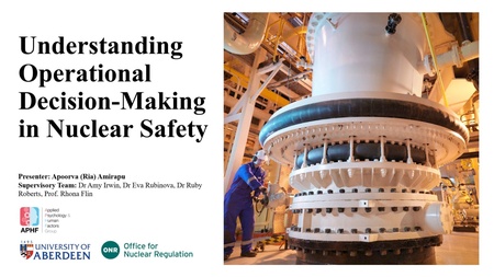 My presentation focused on supporting and enhancing operational decision-making in the nuclear industry, with particular attention to safety-critical decisions are made and supported in the UK nuclear industry, when unexpected situations arise that fall outside existing procedures. The research explores the role of human and organisational factors in shaping decision processes, and how these can be better supported to strengthen nuclear safety.