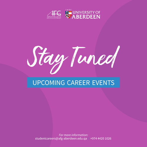 The Employability Boost programme is a virtual series of career live events that are designed to help you improve your skills and employability. You can book the sessions you prefer through https://abdn.targetconnect.net/, attend to develop your skills and get rewarded with Boost Digital Award! For more information please contact studentcareers@afg-aberdeen.edu.qa or call +974 44201026.