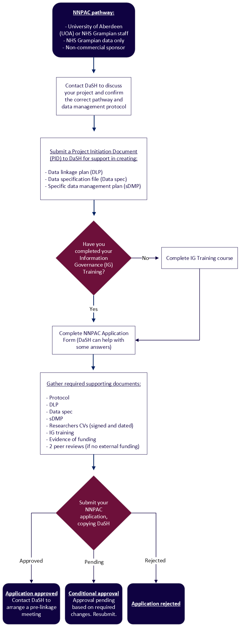 Please note, if you require datasets not covered by NNPAC, all researchers - including those affiliated with the University of Aberdeen (UOA) and NHS Grampian (NHSG) - will need to follow the Full Permissions Pathway. However, if there are datasets you require that are held locally by NHS Grampian, DaSH may be able to amend its Ethics to cover those datasets and your project may be eligible for NNPAC. This should be discussed with DaSH in your initial meeting (see below).