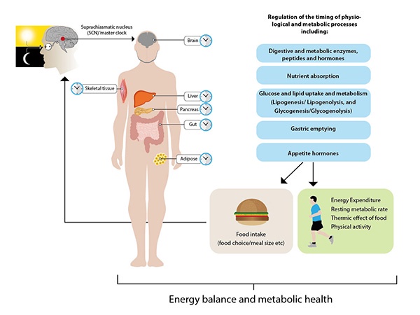 Secondly, meal timing may reinforce or cause misalignment of circadian clocks. Regular meal timing may help to synchronise and amplify rhythms, whereas irregular, particularly late meals or night-time feeding may cause desynchronization and suppressed rhythms.