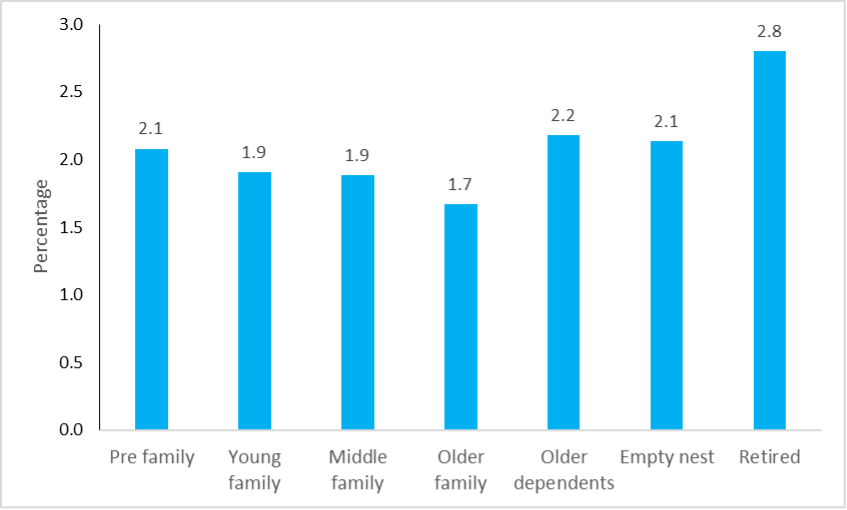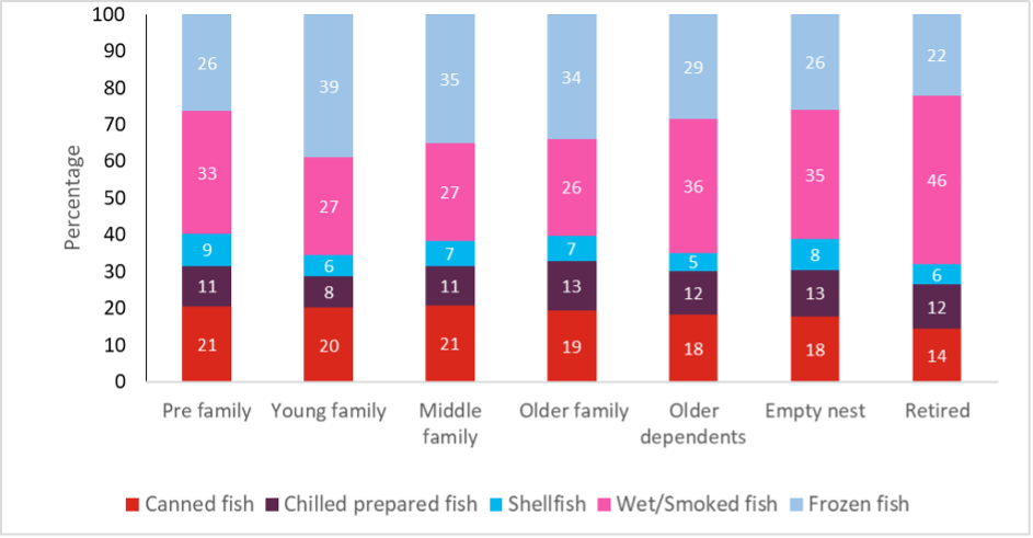 We also analysed how changes in prices and income affect the demand for five aggregate fish categories across seven household groups: pre-family, young family, middle family, older family, older dependents, empty nests, and retired family.