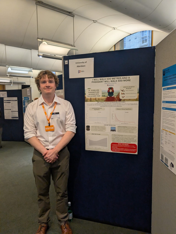 This year, I was fortunate enough to be the undergraduate student that the University of Aberdeen sent to Posters in Parliament. I attended to present the results of my honours thesis, “Post-release distribution of pheasants in Scotland: distance-decay or uniform occupancy?”, which explored long-term patterns of pheasant site use following annual releases and tested the assumptions underpinning current measures designed to protect biodiversity from the impacts of pheasant releasing. I presented my research in the form of a poster titled “I Will Walk 500 Metres, and a Pheasant Will Walk 500 More”.