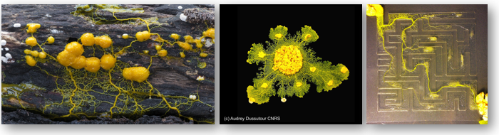 The slime mould Physarum polycephalum is a single-celled eukaryotic organism that forms a large amorphous blob termed a plasmodium. The plasmodium can grow indefinitely and contains millions of nuclei that govern complex problem-solving behaviour in response to environmental conditions, famously finding the most efficient path through a maze or replicating efficient national rail or road networks.