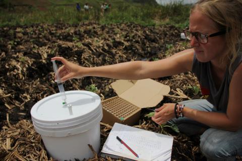 Image: Jenny Farmer taking gas samples in Ugandan wetlands that have been drained and are being used to grow potato