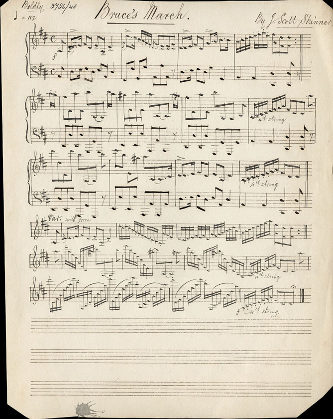 Manuscript of Skinner's Bruce's March, in Gavin Greig's hand, so precise and clear, that the note stems could almost have been made with a ruler. To be played Boldly, the tempo is 112, slightly slower than two marching paces per second.