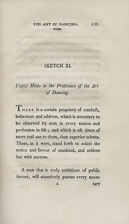 Page 1 of 3 from Sketch 9 of Peacock's The Art of Dancing. He introduces some useful hints on manners for teachers. |