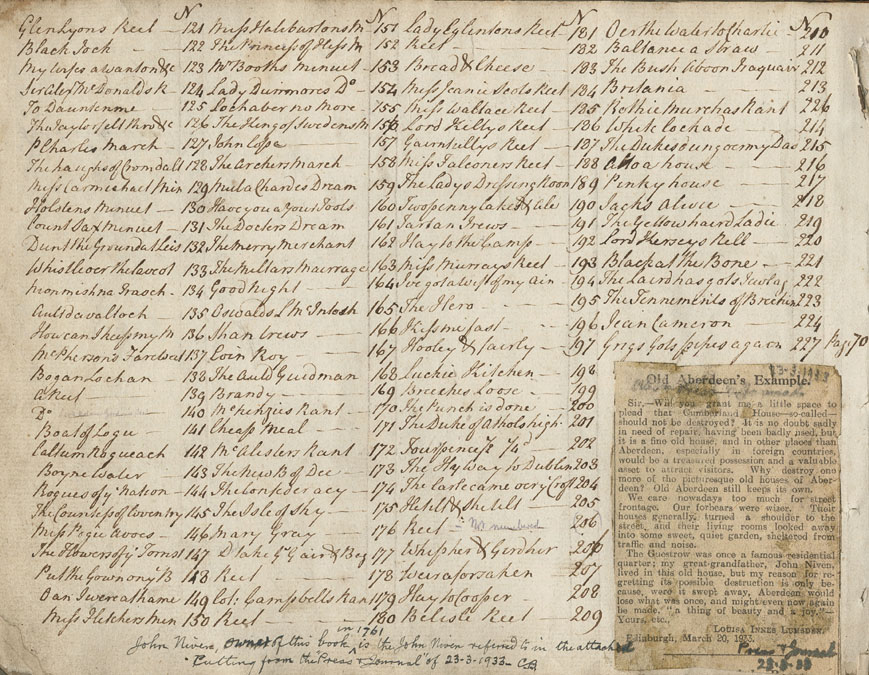 Collection of music 'July 11 1761' transcribed by John Niven. Niven, a wealthy Jacobite sympathiser, lived in what is now known as Provost Skene's House, one of the oldest houses in Aberdeen. Niven's 70 pages of music include 227 tunes, some published by Robert Bremner, and James Oswald. Pasted at bottom right is an Aberdeen Press and Journal clipping [23 March 1933] from Niven's great-grand-daughter, concerned about the possible demolition of Niven's home. The Duke of Cumberland was billeted there in 1746, during the Jacobite War. Perhaps Niven had been his willing - or unwilling - host. |