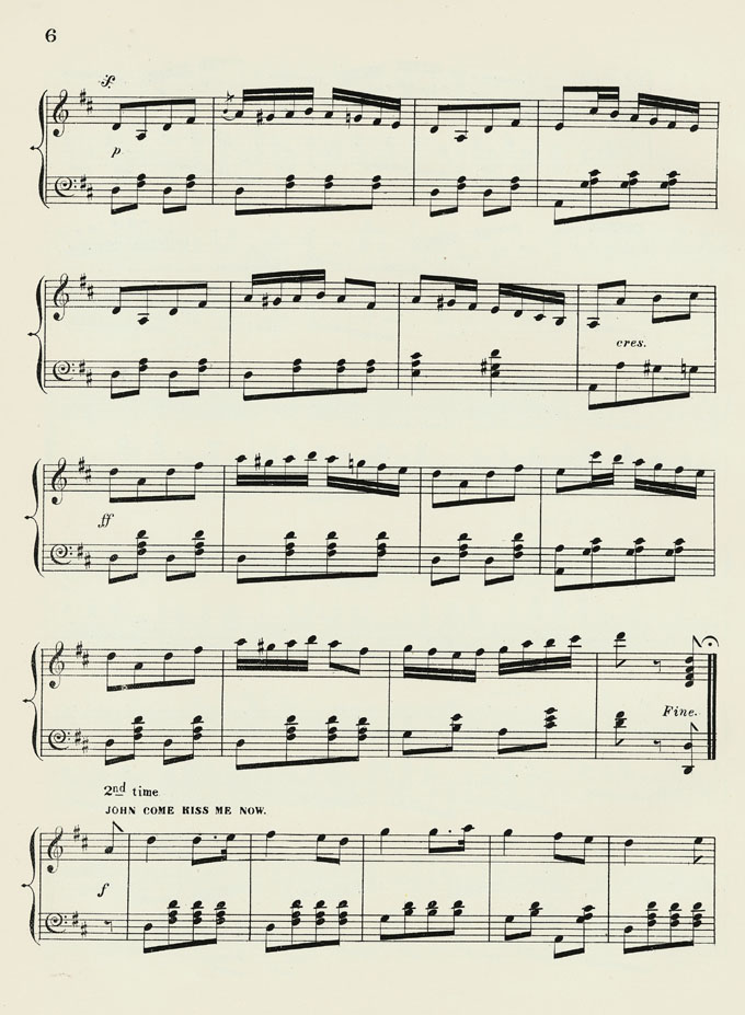 A new dance, the quadrille, was introduced to Scotland from France around 1815, and was soon danced in the United States, and Australia. This continuation of part 5 of the dance begins with a longer version of the first tune in JSS0671, followed by 'John Come Kiss Me Now'.