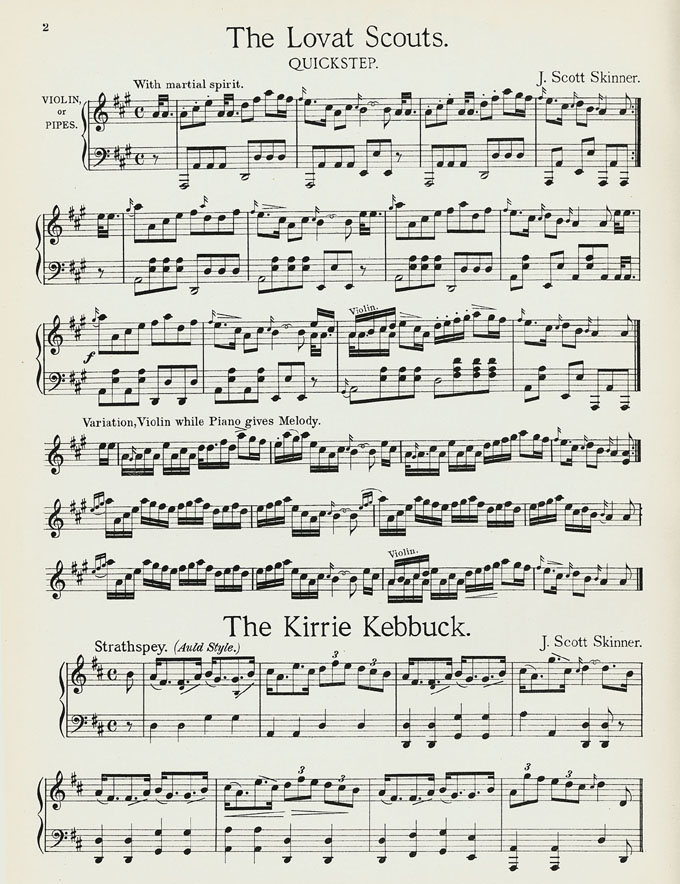 The Lovat Scouts is a lively quickstep, which Skinner wrote in the bagpipe idiom - note the little grace notes in the main part. The simple accompaniment is very much in his style. He adds a variation in his inimitable fashion! Click on the audio link below (cd28a) to listen to Skinner playing it. The Kirrie Kebbuck was a large cheese that the Laird o' Thrums (A MacPherson) cut up with a saw. It is possible to imagine him doing this in time to the music! Click on cd25b to hear Skinner's recording. |