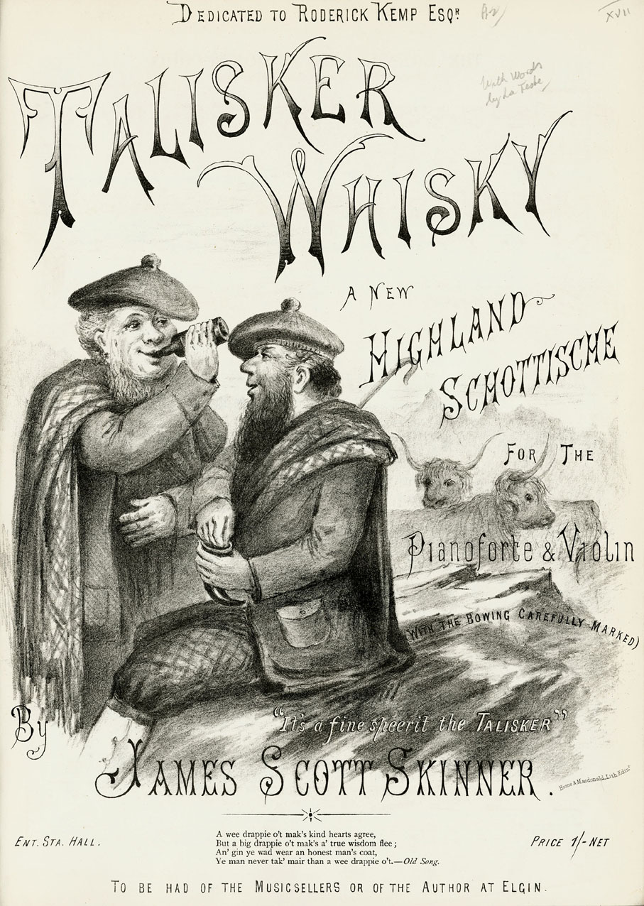 This image of two bearded, bonneted and plaided Highlanders drinking from a bottle, taking snuff, with Highland cattle in the background, seems like an almost music-hall caricature of the Highlands. However, it was merely seen as a humourous image in the late nineteenth century. Between them, through music and image, Skinner and the lithographers have turned this into a fine advert for Talisker whisky! |