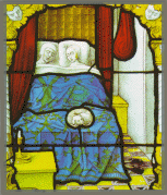The Bedchamber Mice were a problem for clothes too, and in the bedchamber was a pole for hanging clothes on at night so the mice wouldn't nibble them. People didn't wear anything in bed except perhaps a nightcap (nightshirts were not worn until the 14th Century) and they slept half sitting up like this (right)