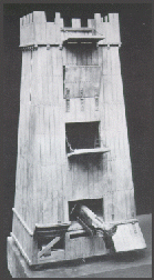 - a tall wooden tower on wheels which could be moved close to the walls. Attackers in the top of the tower would cross over to the walls of the castle using their own wooden bridge.
