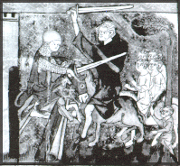 Yvain has no time to wait and charges at the giant, piercing him with his lance. Harpin meanwhile lays about Yvain with his club - but Yvain ducks and slices off a piece of the giant's cheek as big as a steak.